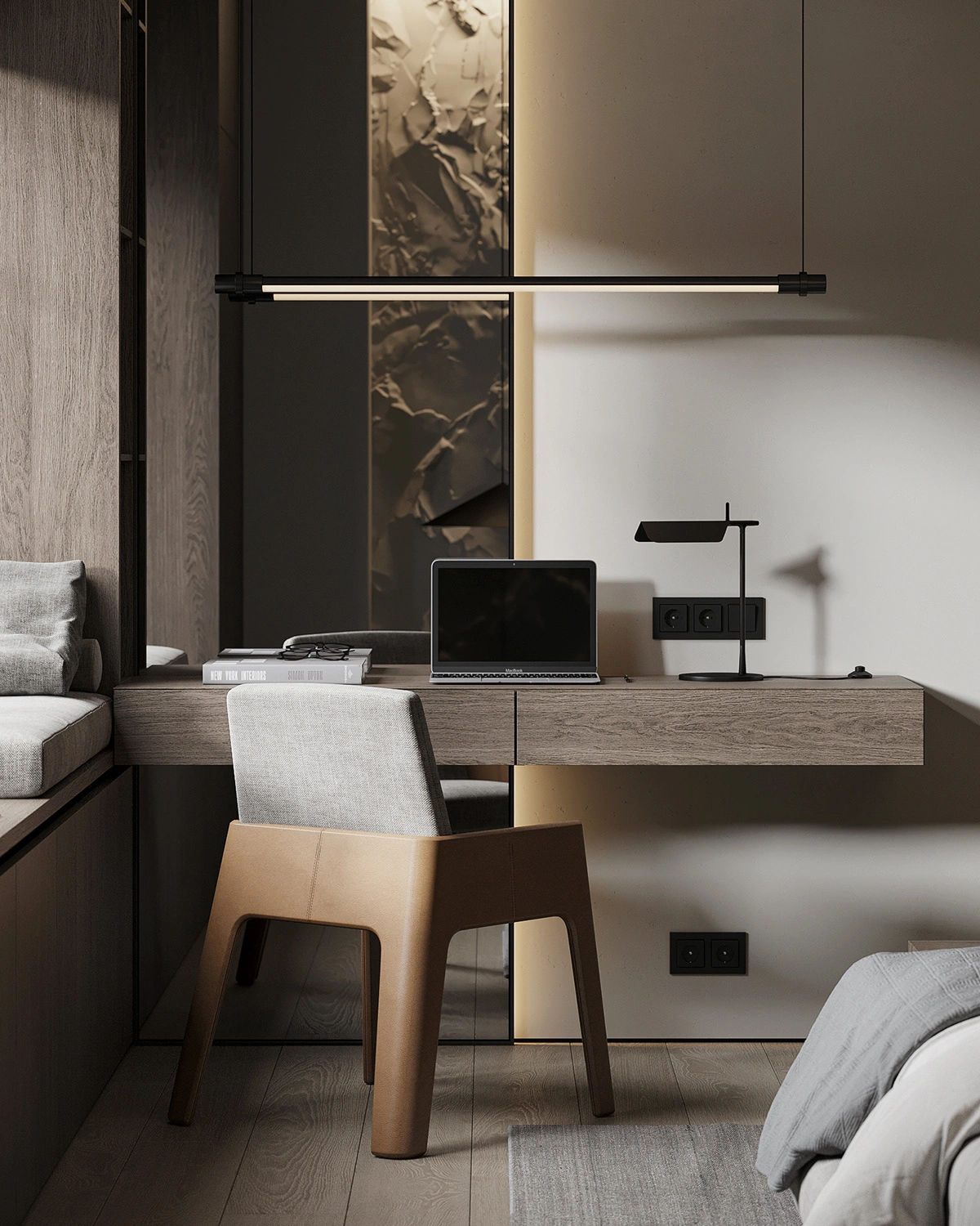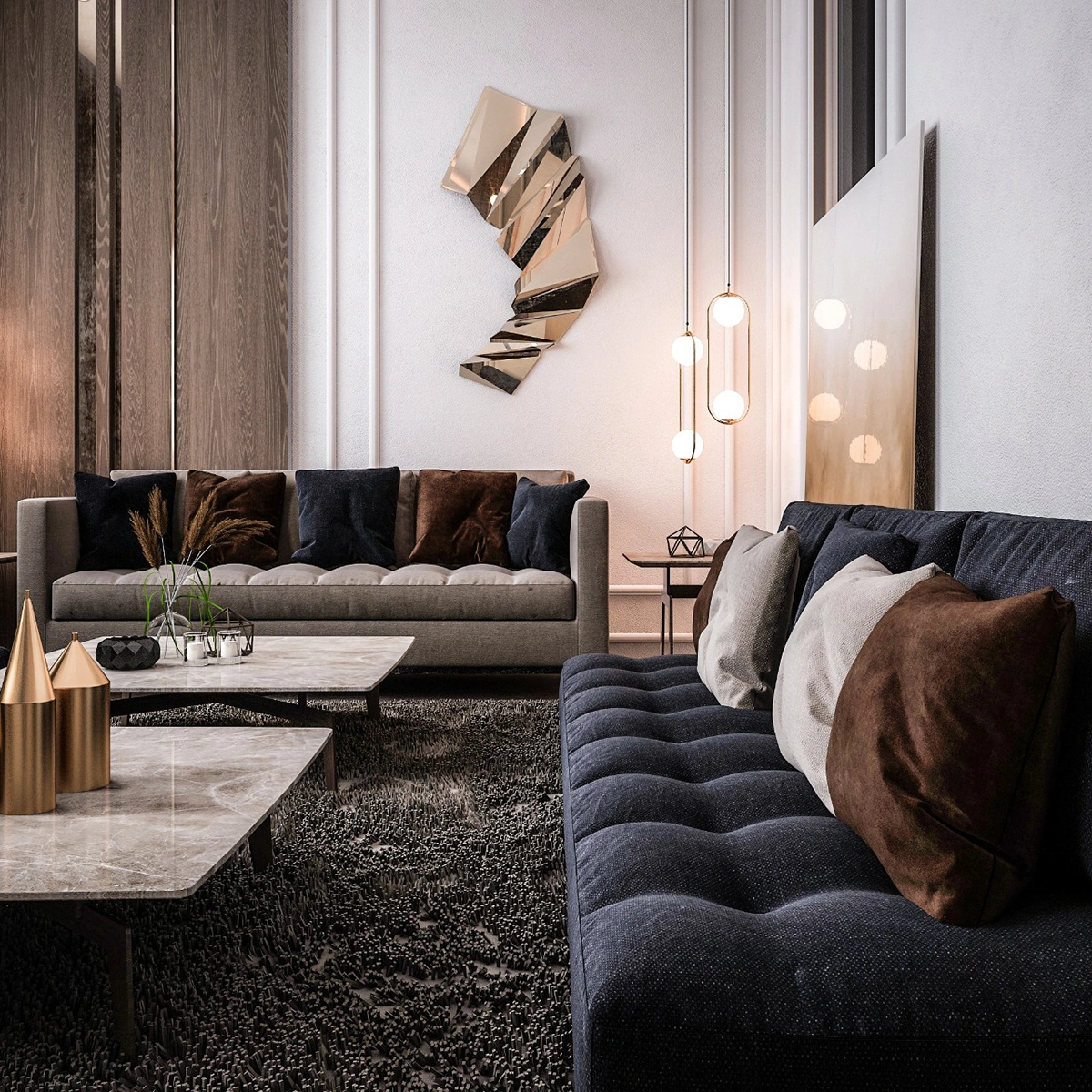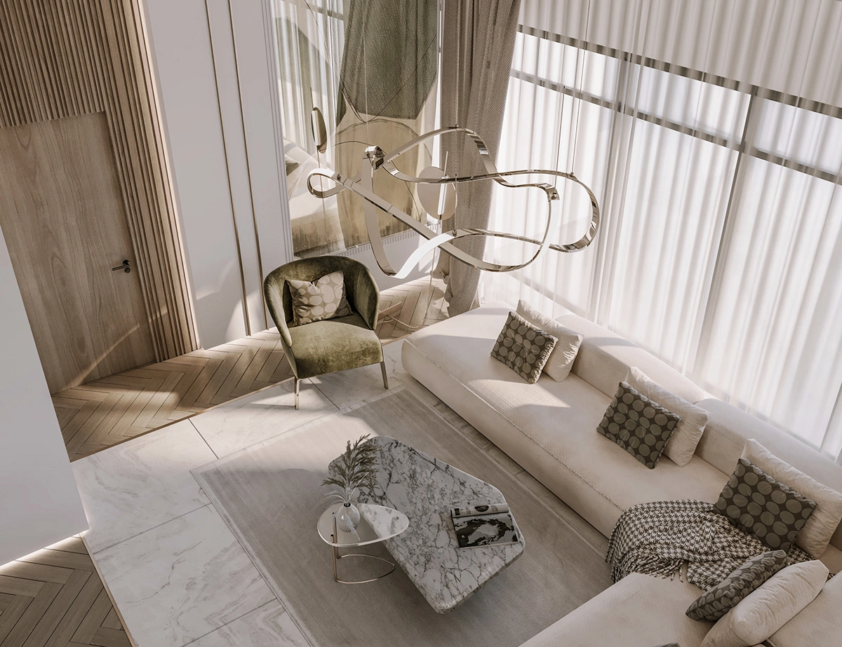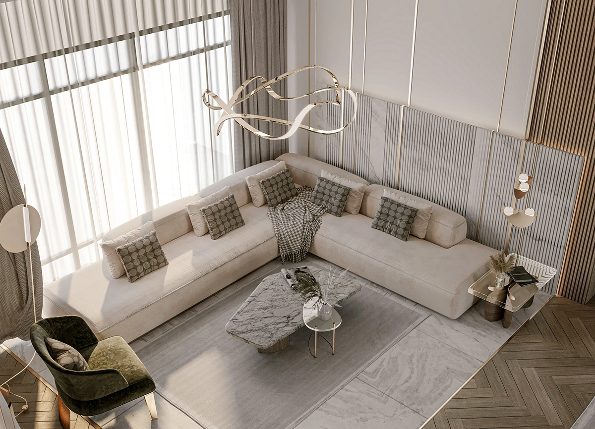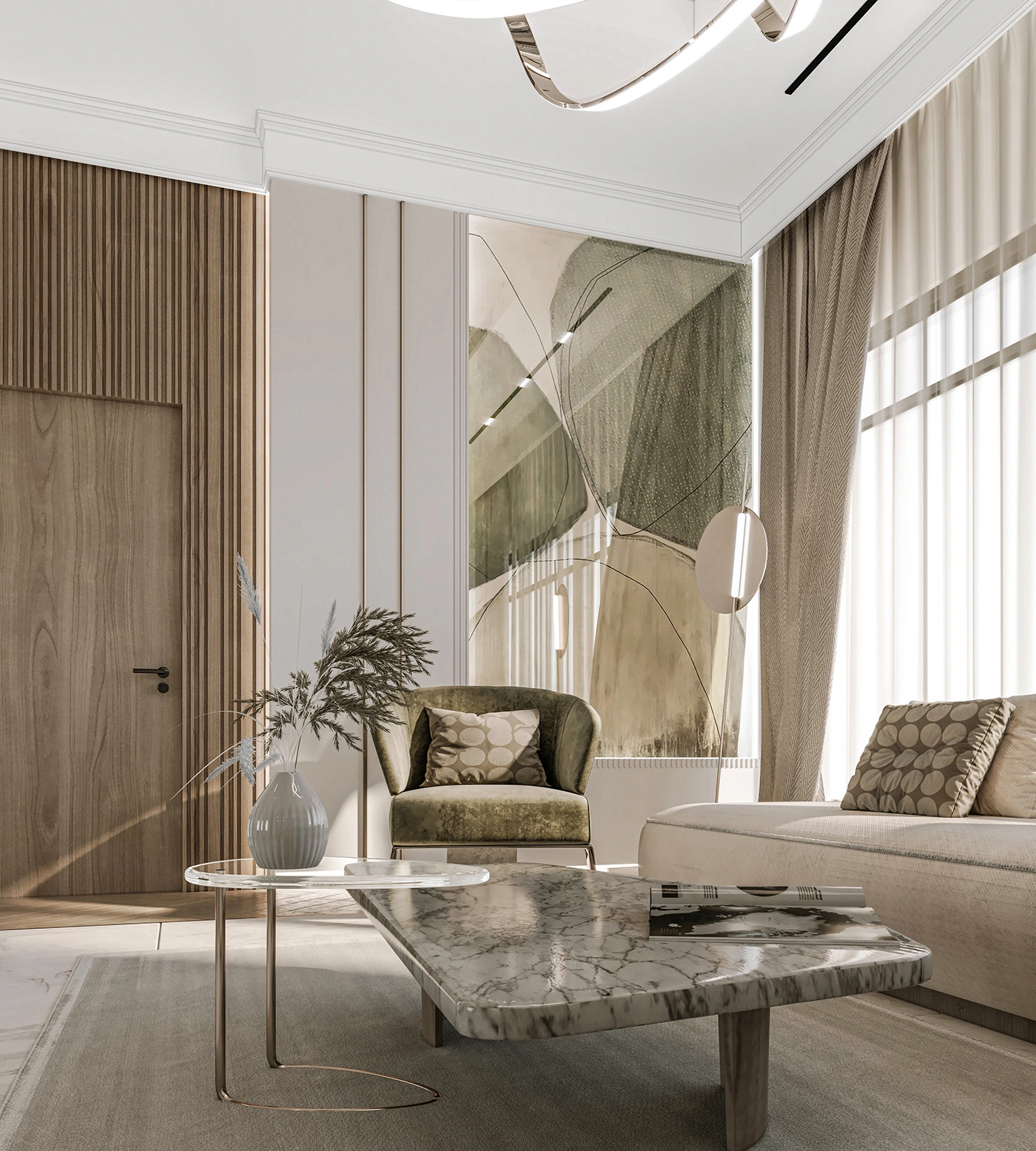 The design focuses on clean lines, balanced proportions, and a calm color palette, creating a soothing ambience ideal for relaxation. High-quality marble textures, stone-finish tiles, and subtle metallic accents elevate the overall look, giving the Home a rich and sophisticated feel. Soft ambient lighting combined with functional task lighting enhances both comfort and visual appeal.